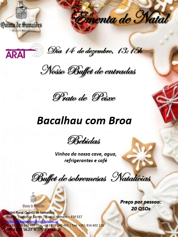 Mais um Natal se aproxima e a ARAT vai novamente comemorar com um almoço convívio no maravilhoso Hotel Rural Quinta de Samaiões, em Samaiões, Chaves, dia 14 do mês de Dezembro (sábado) pelas 13:15h. Contamos consigo.