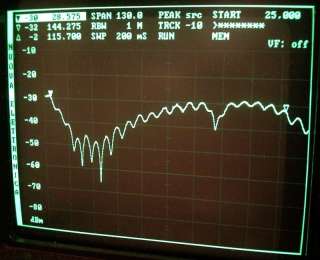 Hay que reconocer que en los extremos de este margen la antena va muy "justa", pero si el equipo lo aguanta es utliizable a falta de una antena mejor. Desde luego en 50 Mhz su comportamiento es ideal. Esta es la gráficasde admitancia (S11) medida con el analizador entre 25 y 155 MHz: