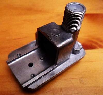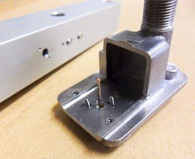Este modelo incorpora algunas "delicatessen" como cierre superior con placa soldada, cierre inferior con placa ajustable, y la posibilidad de incorporar un conector SMA estandar o bien acoplarle directamente un módulo receptor LNB a pll SHARP. Para ello se mecanizó el cuerpo del LNB retirando su guiaonda original, tal como se muestra en las fotos. Ademas en esta segunda antena todo el mecanizado se realizó con el mayor esmero, teniendo en mente el servicio al que iba destinada.