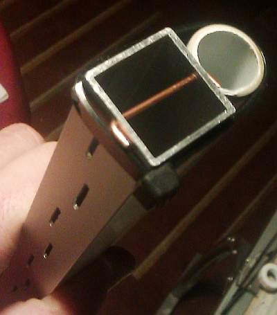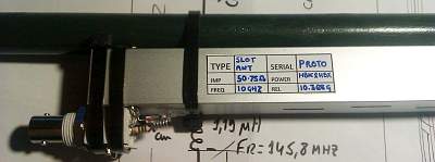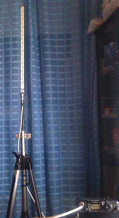 El tubo esta "cerrado" para la RF por sus extremos superior e inferior por un sencillo hilo de cobre que realiza la función de reflector. Detras de el se aprecia el monopolo de 1/4 de onda que alimenta la antena: