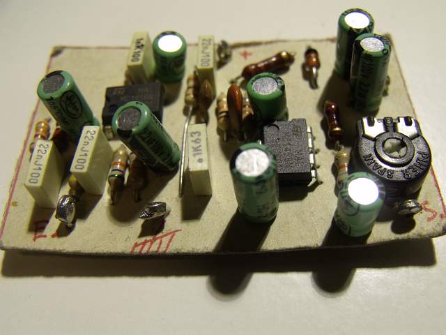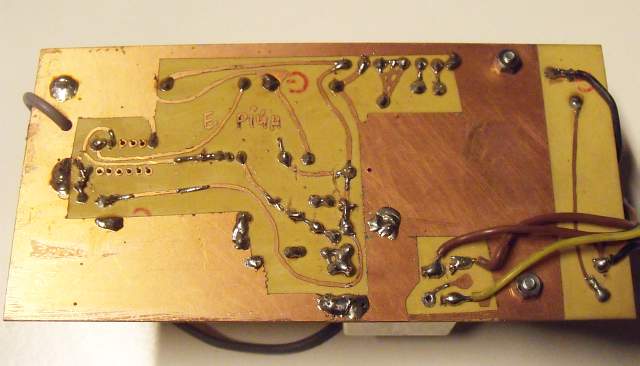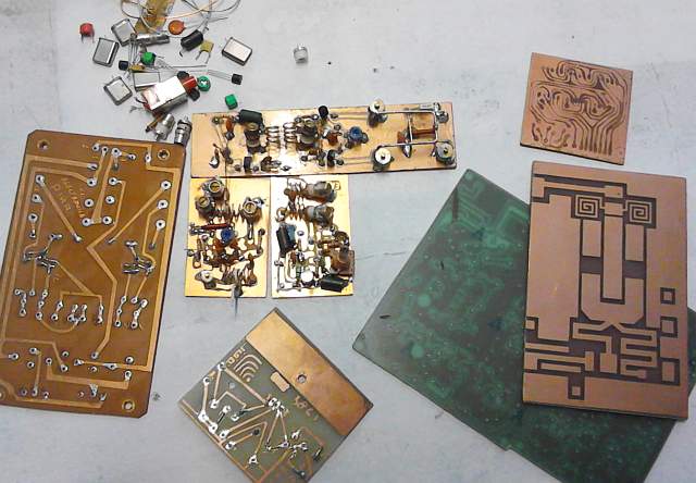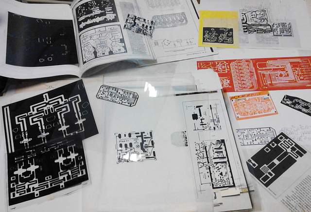 Hoy en día hay fabricas que le mandas el diseño y te manda la placa serigrafiada y taladrada y a un coste relativamente económico, pero al ser montajes únicos y muchos experimentales la mayoría de mis placas de c.i. las hice con rotulador, después de las pruebas correspondientes y el diseño alambrado y con todos los componentes en mi poder y sin usar programas de ordenador, en un trozo de cartón me voy colocando los componentes y diseñando de la mejor manera las pistas de c.i., que alguna pista se cruza y no tengo forma de solucionarlo, pues nada otro trozo de cartón y a empezar de nuevo, algunos diseños están funcionando en el trozo de cartón, le sueldo los componentes, le doy una mano de barniz para que el cartón coja consistencia y a funcionar que era lo que me interesaba, por la cara de las soldaduras no es muy ortodoxo, pero con unos separadores y de cara al chasis no se ve y lo que interesa es la funcionalidad del circuito jejeje.