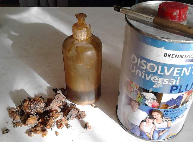 Otra de las cosas que utilizo en los c.i. es el barnizado de la placa, el cobre brillante después del atacado, con el paso del tiempo se pone negro o se oxida con el consiguiente perjuicio, pero al darle una capa de barniz se protege y no se deja oxidar, pero el barniz sintético tiene un problema a la hora de tener que cambiar algún componente que se averíe, todos los barnices comerciales para este caso y ya no digo si son los de capa gruesa, presentan un inconveniente a la hora de desoldar cualquier componente, es aislante y atasca el desoldador y la punta del soldador la oxida, el barniz que utilizo es soldable y protege sobradamente la placa de c.i. y le da un brillo adecuado, consiste en disolver la resina de los pinos en disolvente nitrocelulosico, se recoge resina por el monte y se le añade disolvente, se remueve asta que este perfectamente disuelto, se cuela con cualquier filtro, yo utilizo el de las cafeteras y ya tenemos un barniz que además de protegernos nuestra placa perfectamente, nos ayuda en las posibles averías al ser un decapante y limpiar los componentes y nuestro equipo de soldadura. El pequeño defecto es que tarda algo mas en secar que un barniz sintético, por lo demás todo ventajas, con el paso del tiempo en el recipiente en que lo tengamos se pone algo mas viscoso, que también nos beneficia al permitir que la capa que le demos al c.i. sea mas gruesa o le podemos añadir mas solvente y lo ponemos a nuestro gusto, lo utilizo desde hace muchos años y me es una buena herramienta a la hora de dejar una placa de c.i. brillante y protegida.