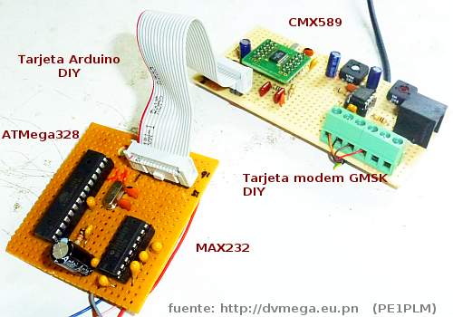 En la foto puede apreciarse, montada sobre placa de prototipos, la tarjeta del modem con el chip CMX589 sobre una PCB adaptadora SMD--->TTH, y unos mínimos componentes accesorios; además de un doble operacional y sus potenciómetros para los correspondientes ajustes de nivel TX-RX (esta placa es la que conecta el Arduino con el Transceptor de radio). Pinchando sobre la imágen puedes ver la foto original en alta resolución.