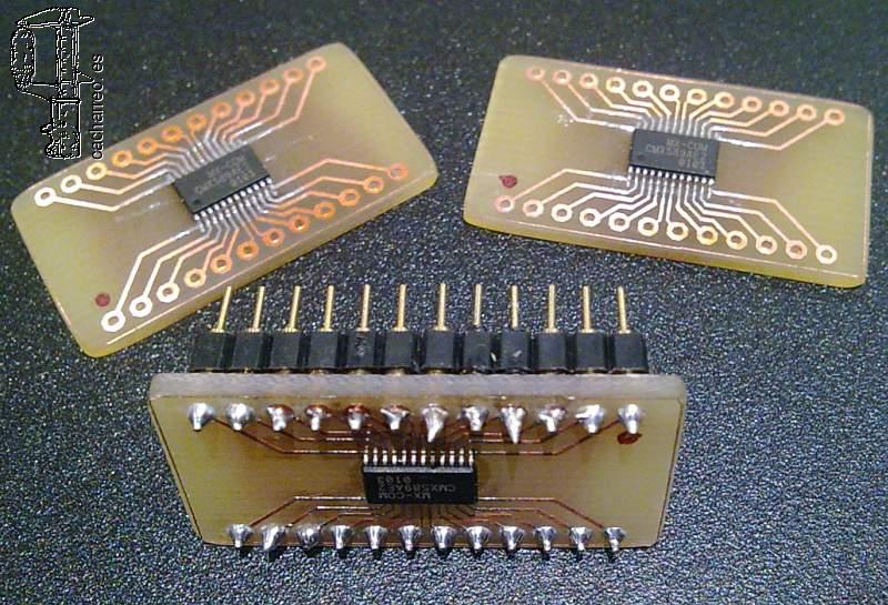 La poca disponibilidad de modems CMX en encapsulado DIL nos llevó a producir nuestros propios adaptadores para emplear los chips CMX en formato SMD miniatura.