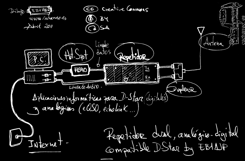 Y este es el diagrama básico del primer prototipo de repetidor. Completamente operativo y funcional.