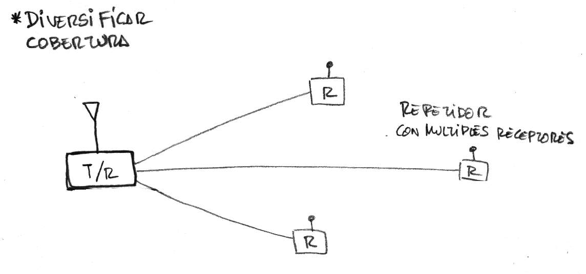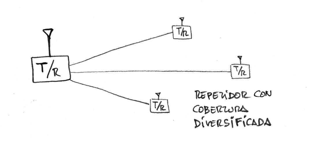 ... O diversificando la cobertura mediante transceptores, o repetidores deslocalizados. A menudo esto conlleva la multiplicacion de uso del espectro a través de enlaces y transceptores secundarios mas allá de lo razonable, haciendo que un único canal de voz aparezca repetido ocupando múltiples canales de radio.