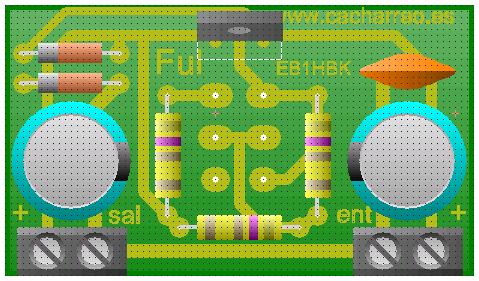 A pesar de su simplicidad hemos preparado una mini PCB donde alojar todos los componentes, incluso el conmutador, para que resulte compacto y manejable. El integrado regulador se ha colocado en el extremo para facilitar la unión de un disipador de calor de cualquier tipo, pero de suficiente capacidad disipativa, para mantener al LM317 contento.