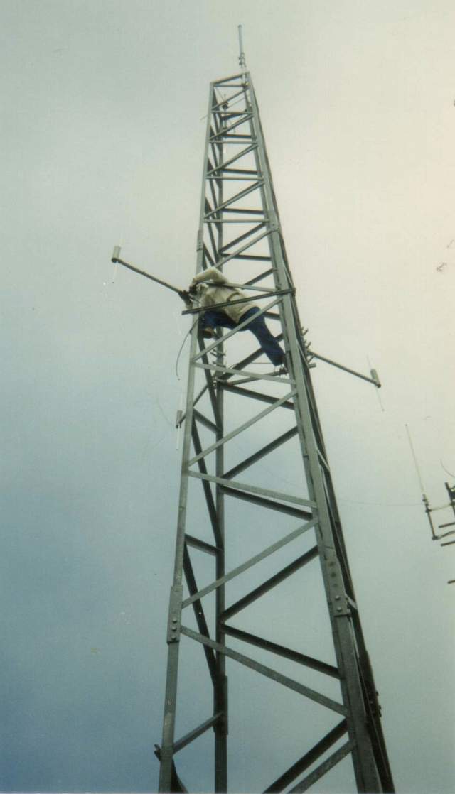 Los problemas con los repetidores son bastantes y algunos complejos por la cercanía de un trasmisor y un receptor trabajando al mismo tiempo, con las consiguientes pruebas se fue adquiriendo la experiencia para ponerse manos a la obra de la instalación de el R-6 que su primera ubicación fue en las instalaciones de RTVE en Meda. EA1MD como manitas en temas mecánicos y yo nos acercamos una tarde asta meda para tomar medidas de la puntera de la torre de TVE y por juventud o ganas de hacer cosas me toco a mi medir la altura de dicha torre y tomar nota de las posibilidades de colocar en la cima nuestra antena de recepción del R-6. Llego el día planeado para la colocación de las antenas, recuerdo que era un domingo por la mañana y lo que mas recuerdo sobre todo el frío que hacia y el que pase, que creo que me tome una botella de anís y lo único que conseguí fue colocarme pero el frío fue tal que ni metido en la ducha durante mas de una hora conseguí quitármelo, por mi parte puedo asociar el R-6 y el frío, puesto que en otra ocasión y ya en Manzaneda aprovechaba los travesaños de la torreta para ponerlos frete a la cara y que no me diera el aire que con el frío que hacia me daba la sensación de que me podía pasar algo.