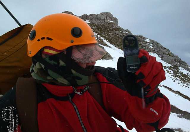 Aun así nos acercamos todo lo que podemos protegidos por una arista de nieve y allí agazapados levanto el anemómetro para tener un dato obejivo de como est la cosa. 115 Km/h... hummmm... no está mal. mientras estiraba el brazo todo lo que podía para exponer el medidor fuera del abrigo casi me sentí ingrávido en un par de ocasiones. Entretanto volvemos a eschuchar aquel estampido sordo que nos llamo la antención antes y que estaba producido por el mismo viento al romper contra las aristas rocosas de la cumbre a escasos metros de nosotros.
