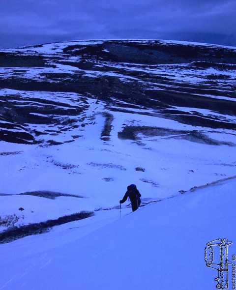Desde el chozo estudiamos el camino de subida que por suerte transcurre en cierto modo al abrigo de la zona mas expuesta al viento. Un breve destello de sol que ilumina la cumbre nos da el ánimo definitivo y nos ponemos en marcha. el estado de la nieve es muy variado, alternado zonas de nieva blanda y pesada con placas duras donde se agradece la seguridad adicional de los pinchos. El ascenso no representa mayor complicación salvo la incomodidad de las frecuentes paradas para hacer frente a las ráfagas de viento arremolinado que hacen todo lo posible por desequilibrarnos. un estampido sordo, como una mezcla de trueno o un disparo lejano, nos hace detenernos un rato para evaluar la situación y determinar su origen. No apreciamos signos de tormenta, y no nos ha parecido un trueno asi que continuamos el ascenso hasta el circo que se abre unos metros mas arriba, donde la pendiente se hace ya mas suave.