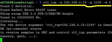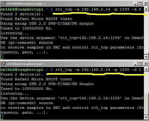 - $ rtl_tcp -a 192.168.2.14 -p 1235 -d 1