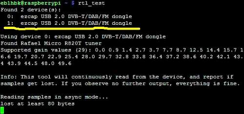 Una vez satisfechos los requisitos anteriores, enchufamos en el HUB los dos receptores TDT y ejecutamos el comando rtl_test (desde una consola local o remotamente por ssh), a ver que ocurre...