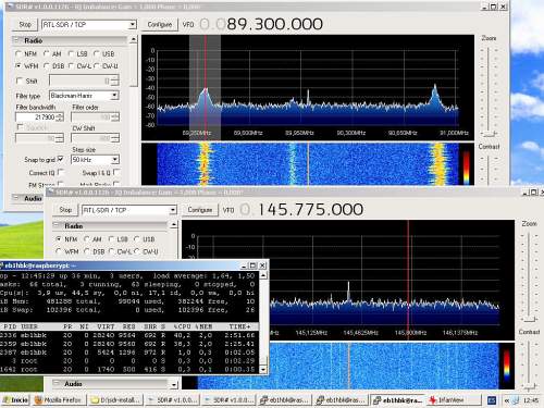 Aqui tenemos una captura de escritorio con las dos instancias de SDR# corriendo en el mismo PC cliente, en una se recibe la FM comercial en W FM y en la otra se ve el segmento de radioaficionados de 144 en FM-N. en cada caso el ancho de espectro monitorizado de de 2 MHz, con lo que en total estamos visualizando 4 MHz de espectro. Aquí la mayor carga de tarea corre a cargo del PC cliente, puesto que debe realizar toda la función de DSP para monitorizar el espectro y proceder la demodulación de las señales correspondientes, pero... ¿que ocurre entretanto en el Raspi?...