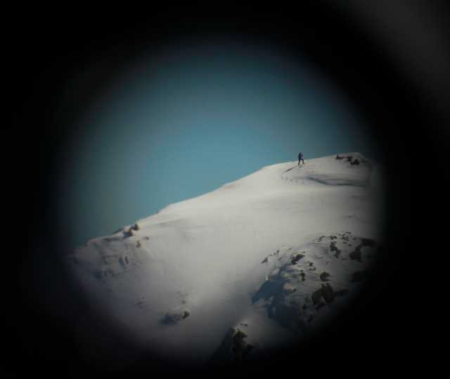 De mañanita alcanzamos la cumbre del Rachón EA1GDH y yo. EA1ICV decidió aguardarnos en el Diablo Sur para no forzar una articulación en proceso de recuperación. Fué el quien tomó las curiosas fotos a través de los prismáticos que se ven en la