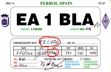 banda de 2,3 GHz, en un ameno QSO con EA1BLA, durante el cual pudimos comprobar el correcto funcionamiento de la antena y el transverter de EA1DG.
