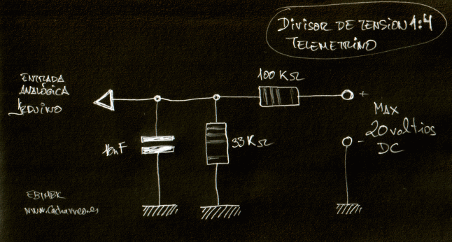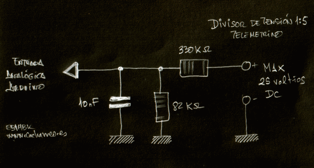 - Un divisor de tensión 1:5, que admite una entrada máxima de 25 voltios y que monitoriza la alimentación genral de 12 voltios.