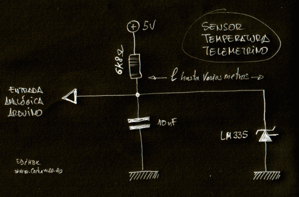 - para los sensores de temperatura utilizamos el LM335, que al trabajar con una tensión de 5 voltios es preciso polarizarlo con una resistencia de valor comprendido entre 5K y 10K.