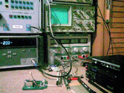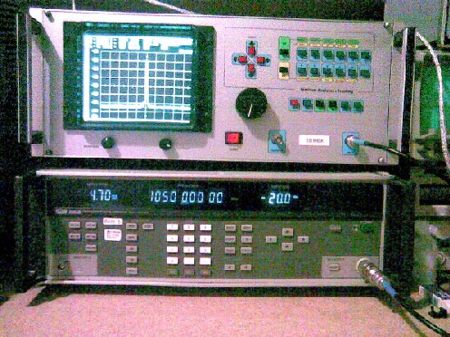 Lo principal del banco de trabajo es un analizador digital de espectro con traking de 1.1GHz, un generador de señal de 1.05GHZ, y un osciloscopio de doble trazo analogico de 60MHz, junto con acesorios varios de medida y otros equipos mas básicos para las medidas mas simples de tensiones, frecuencias...