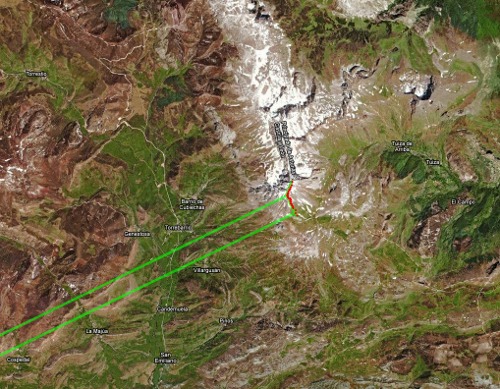 En las capturas del mapa de ARPS aparecen unas manchas blancas de nieve, pero no corresponden con el momento real de la ascensón. Ese día había muchísima mas.